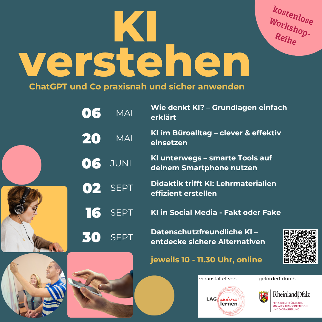 In diesem Jahr dreht sich bei uns alles um Künstliche Intelligenz – in 6 Online-Workshops zu Themen wie Grundlagen verstehen, Lehrmaterialien erstellen, Datenschutz und KI im Büro und unterwegs.
